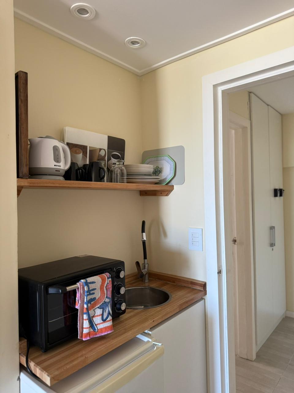 Baño y kitchenette completa con horno eléctrico y pava eléctrica.